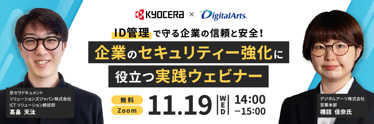 | 14:05~ | ID管理の盲点が、セキュリティーリスクを生む。 ~見落とされがちな課題と、今すぐ取り組むべき対策とは~ 登壇:京セラドキュメントソリューションズジャパン株式会社 |
