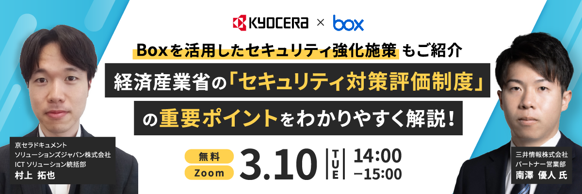 | 14:05~ | 「セキュリティ対策評価制度」はまるっと京セラにお任せください! Boxをはじめ貴社に最適なソリューションをご提案いたします 登壇:京セラドキュメントソリューションズジャパン株式会社 |